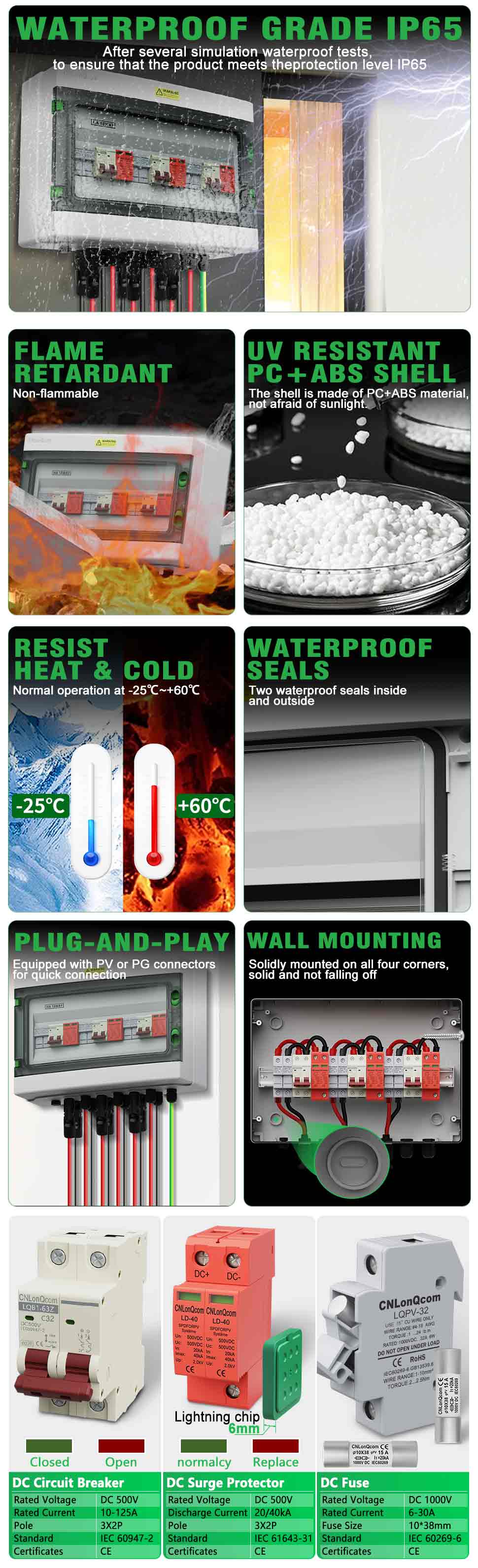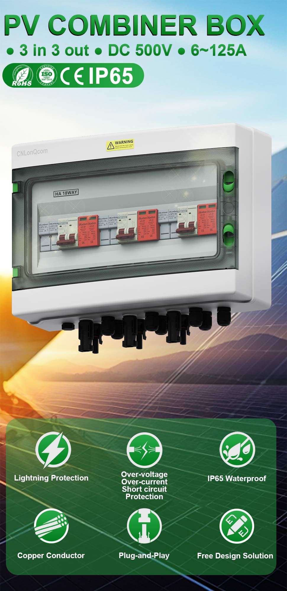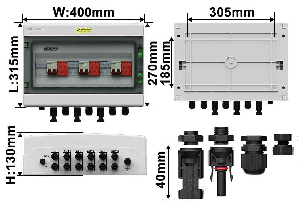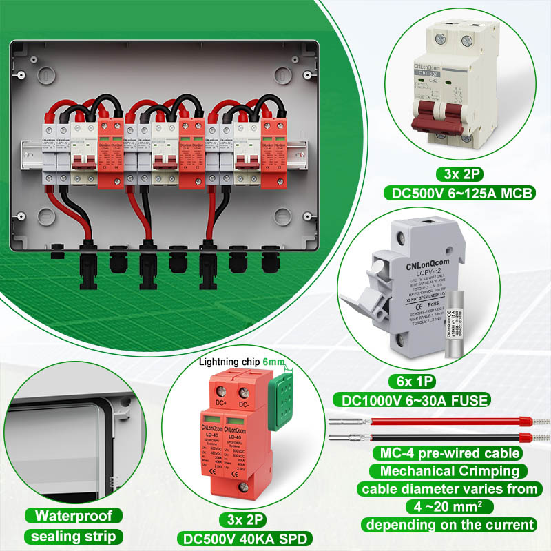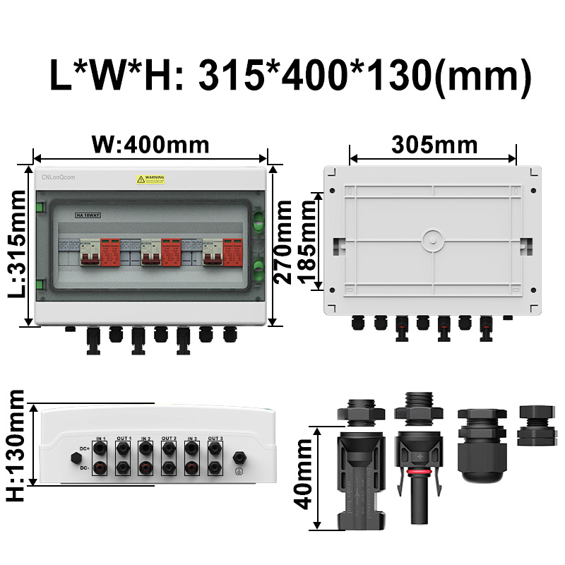 CNLONQCOMのHAシリーズプラスチックPVコンバイナーボックス3 in 3 OUT DC500Vは、密閉された構造、過負荷保護、短絡保護、過電圧保護、ダスト、湿気、稲妻保護を備えたPC+ABS防水ケースを備えています。