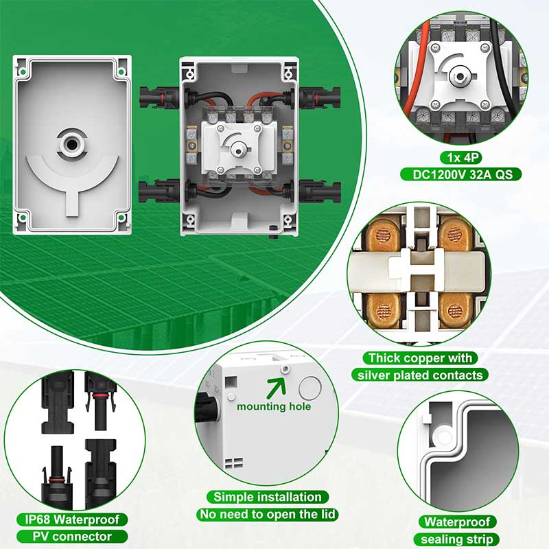 ● さらに、当社の PV ソーラー切断スイッチ DC1200V 32A 2in 2out には、IP66 防水ケースが付属しており、高品質のプラスチック素材で作られ、耐紫外線性を備えた優れた保護レベルを提供し、配電ボックスに適した 2 ~ 4 極のオプションを提供します。コンパクトな設計で屋外での使用に適しており、アイソレータ スイッチを雨、ほこり、その他の天候要素から保護します。